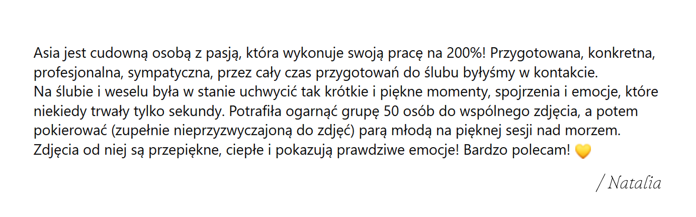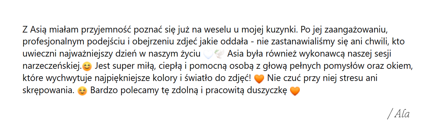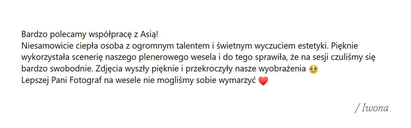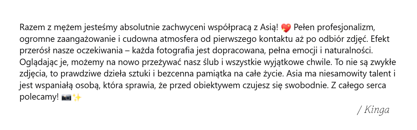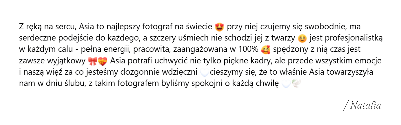 tak, byście mogli po prostu być sobą. Nazywam się Asia i moim zadaniem jest stworzyć atmosferę, w której emocje dzieją się naturalnie, a zdjęcia stają się pamiątką, do której wraca się latami. Zdjęcia, które się nie tylko ogląda, ale także przeżywa.
